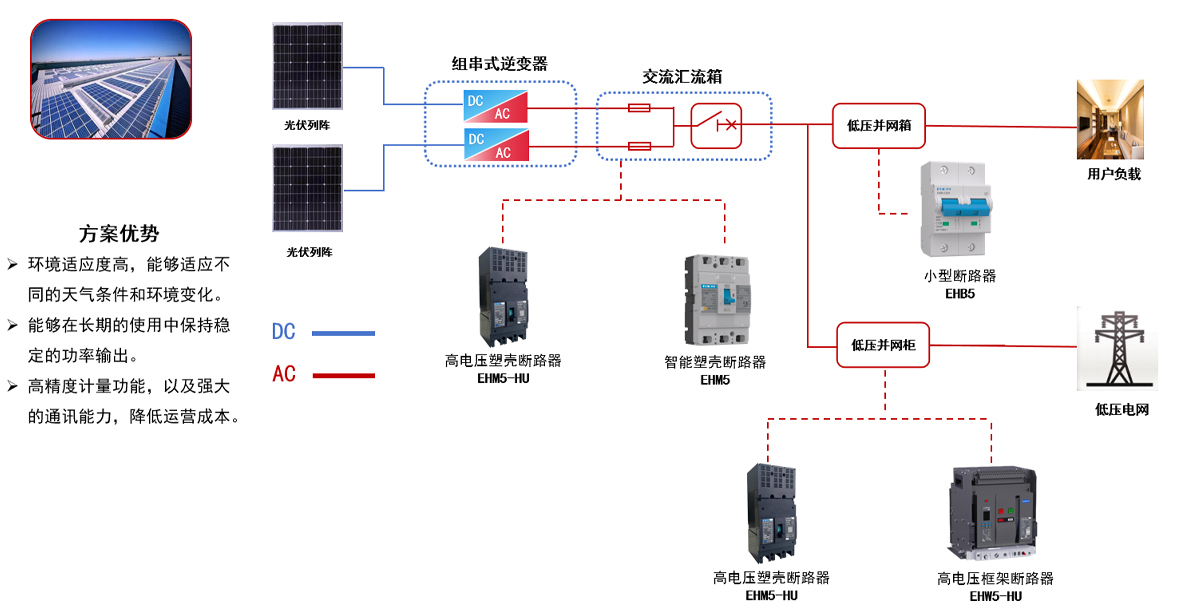 组串式:先逆变,再交流侧汇流;适用于地势复杂项目,如山丘电站、建筑屋顶电站等;电能质量差,功率密度小,发电效率高;